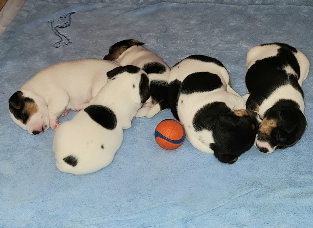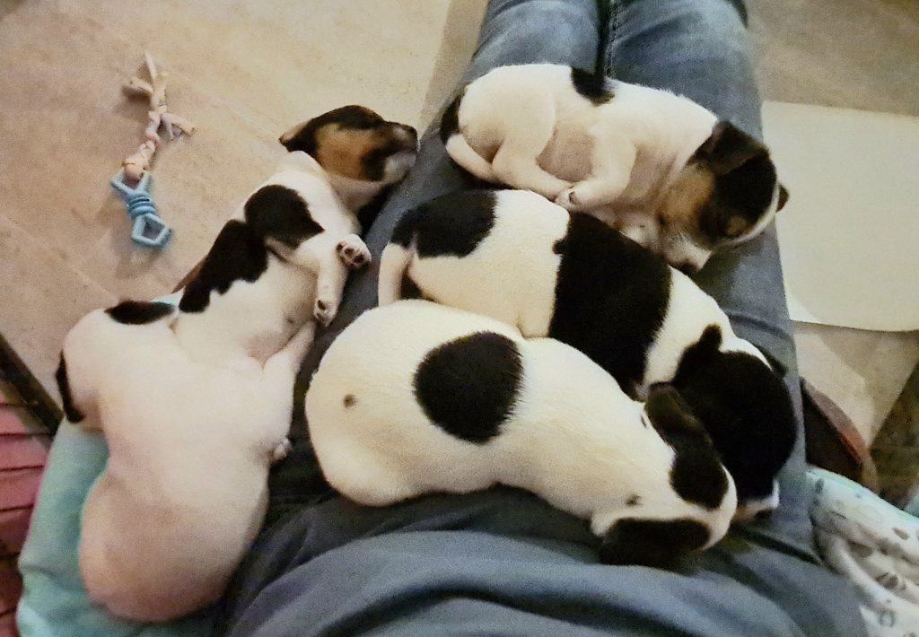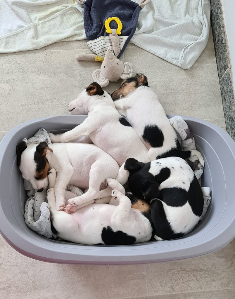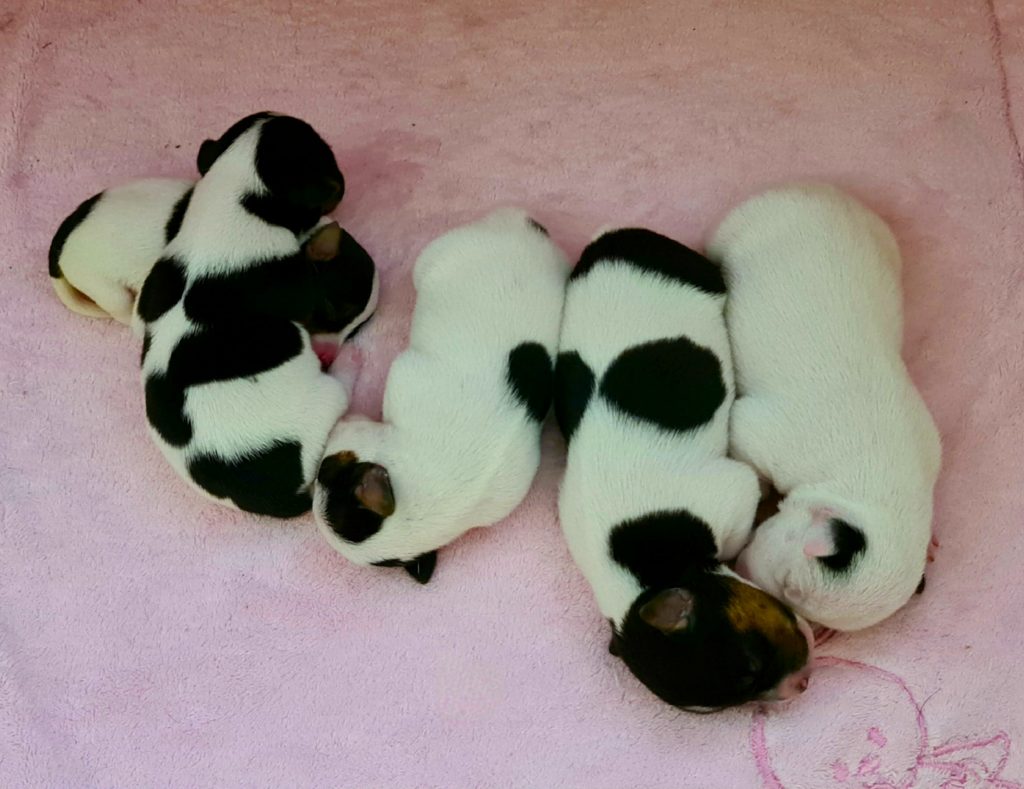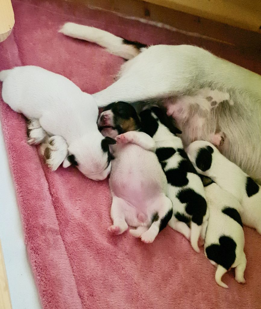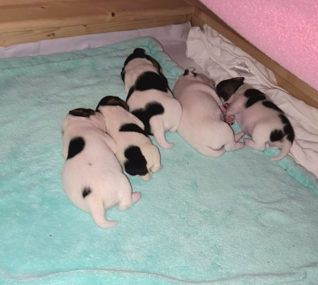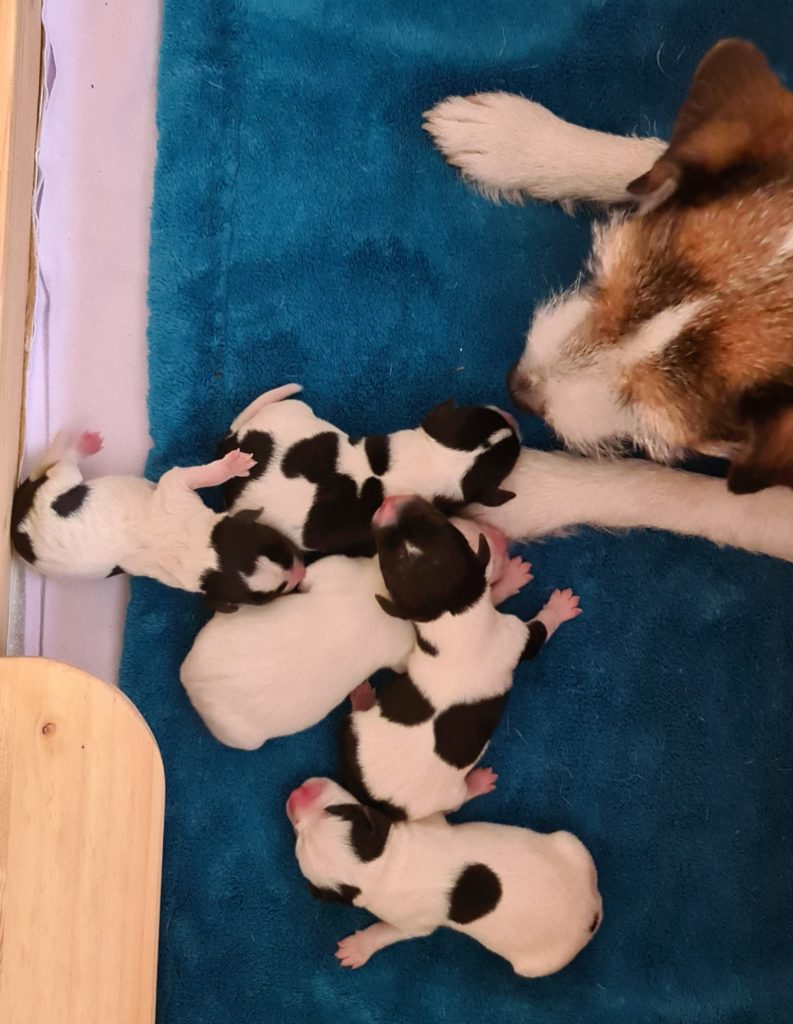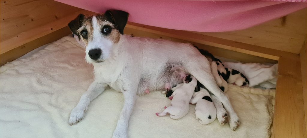 Am Montag hat unsere Tilda ihren E-Wurf geboren. Es war, wie schon von ihr gewohnt 🙂 , eine unkomplizierte Geburt und wir freuen uns über 5 gesunde, hübsche Terriermädchen.